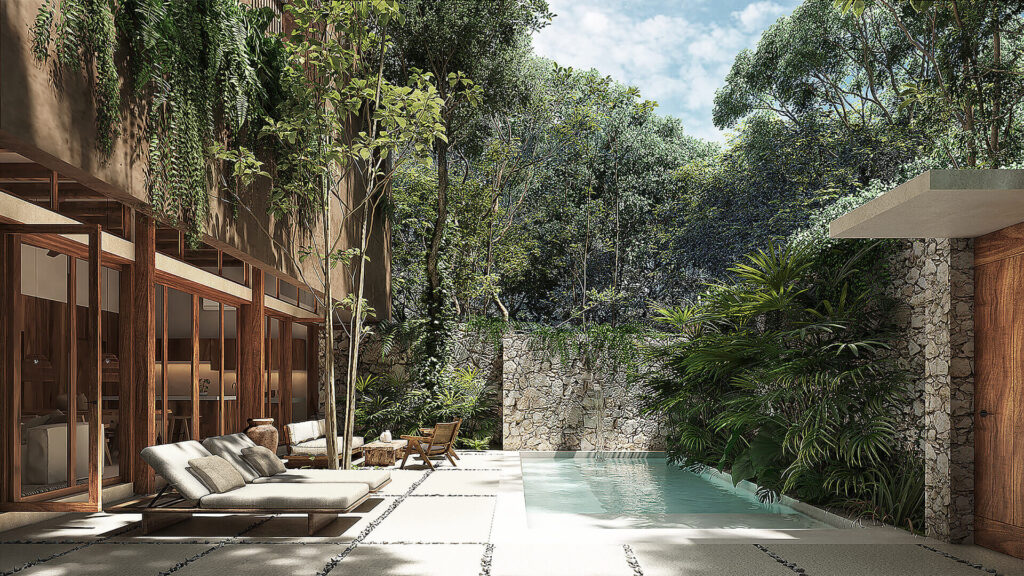 Kokoon’s architecture evokes the silent elegance of ancient tropical haciendas. Clean lines, noble materials, and bespoke details create atmospheres that pay tribute to tradition: stone, tropical woods, natural stuccos, and warm textures that converse with the jungle, the light, and—specifically in this case—the climate of Tulum. Nothing here is imposed; everything is integrated, respected, and honored.